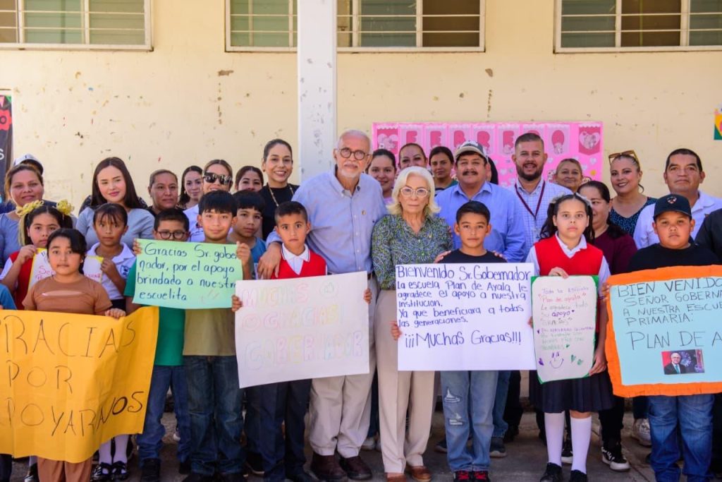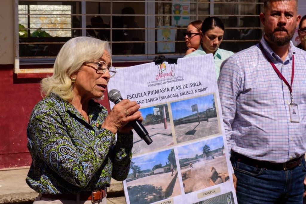 Xalisco, Nayarit.– El gobernador del estado, Miguel Ángel Navarro Quintero, acompañado de su esposa, la doctora Beatriz Estrada Martínez, presidenta del Sistema DIF Nayarit, visitó la escuela primaria Plan de Ayala, ubicada en la localidad de Emiliano Zapata (Majadas), municipio de Xalisco, donde anunció diversas obras para mejorar las condiciones educativas.