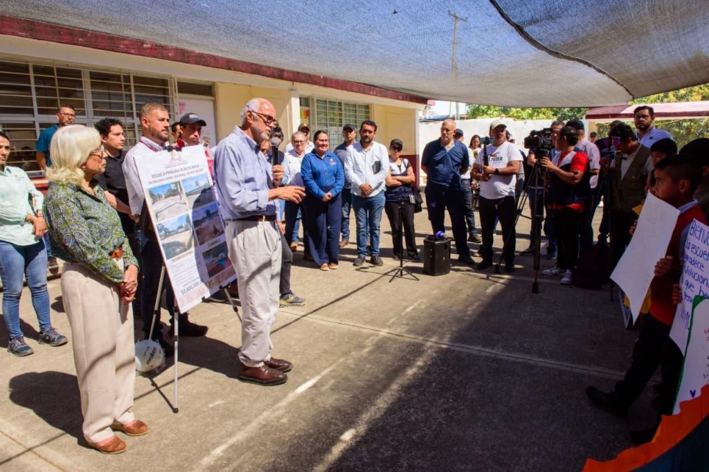 Durante el recorrido, el mandatario estatal informó que se construirá una nueva cancha escolar diseñada para evitar hundimientos o resquebrajamientos que puedan representar riesgos para el alumnado, con el objetivo de brindar espacios seguros para la práctica deportiva y actividades escolares.