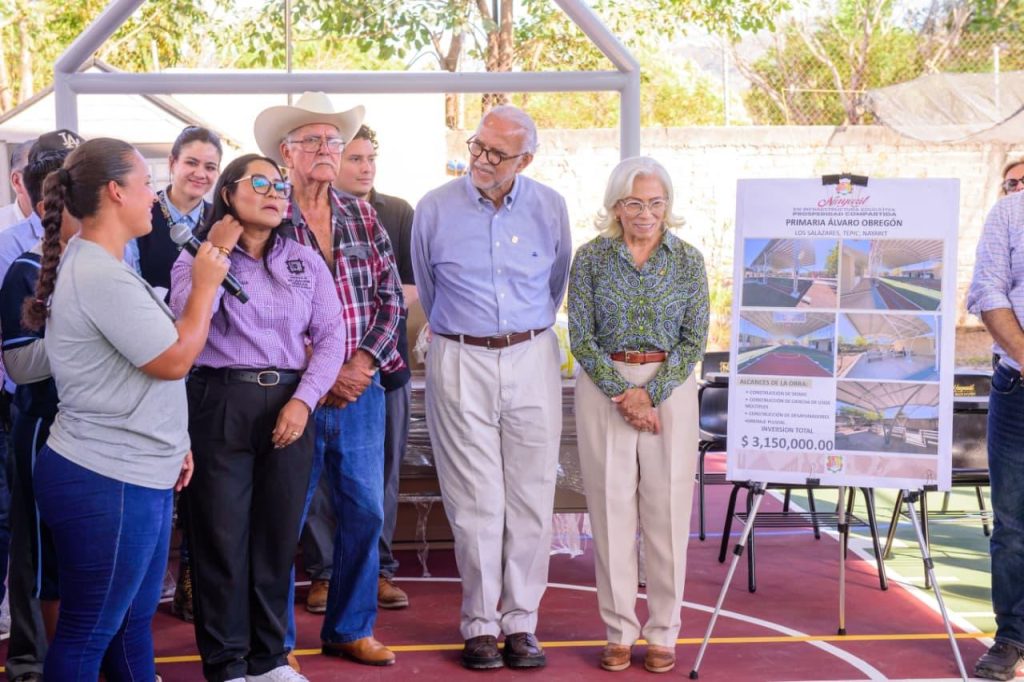 Tepic, Nayarit.– El gobernador del estado, Miguel Ángel Navarro Quintero, acompañado por su esposa, la doctora Beatriz Estrada Martínez, presidenta del Sistema DIF Nayarit, entregó obras de infraestructura educativa en la escuela primaria “Álvaro Obregón”, ubicada en la localidad de Los Salazares, municipio de Tepic.