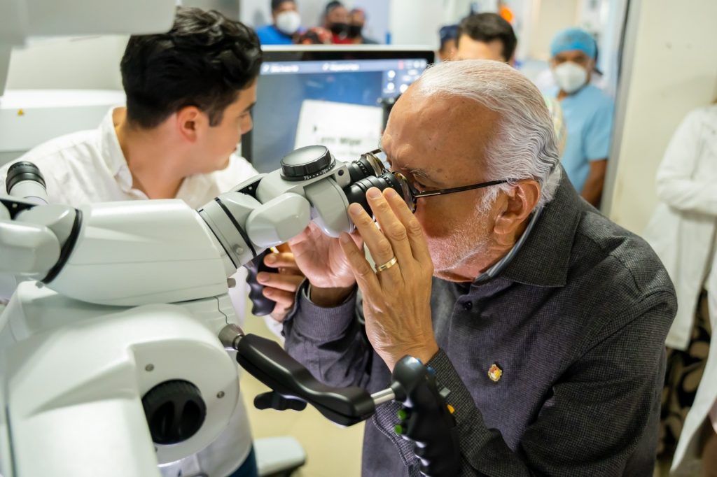 El gobernador del estado, Miguel Ángel Navarro Quintero, y su esposa, la presidenta del Sistema DIF Nayarit, doctora Beatriz Estrada Martínez, supervisaron la operación de un microscopio quirúrgico de alta precisión en el Hospital de Especialidades IMSS-Bienestar “Dr. Antonio González Guevara”, en Tepic, equipo que ya se encuentra al servicio de la población.