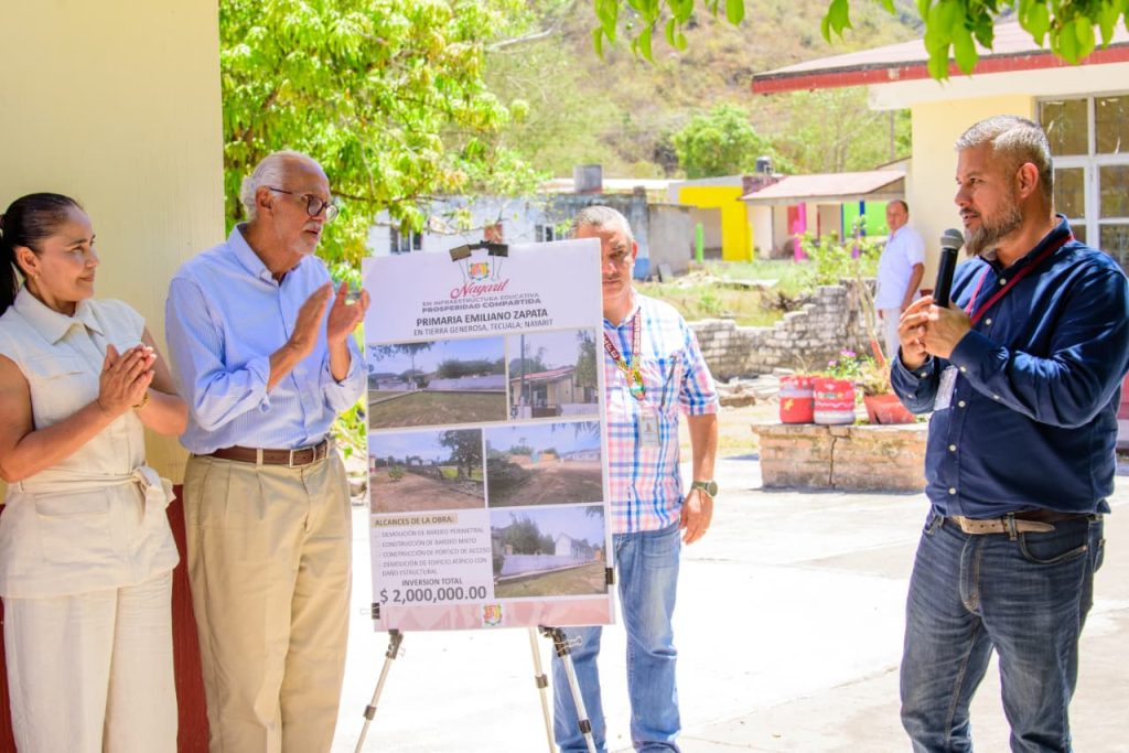 En la escuela primaria Emiliano Zapata, de la localidad de Tierra Generosa, municipio de Tecuala, el gobernador del estado, Miguel Ángel Navarro Quintero, dio inicio a la intervención integral para mejorar las condiciones en las que niñas y niños realizan sus actividades escolares diariamente.