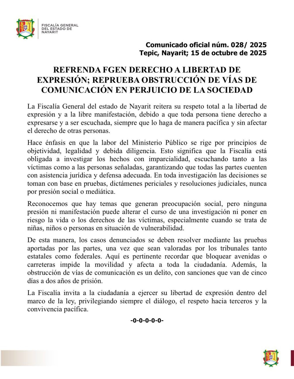 La Fiscalía General del estado de Nayarit reitera su respeto total a la libertad de expresión y a la libre manifestación, debido a que toda persona tiene derecho a expresarse y a ser escuchada, siempre que lo haga de manera pacífica y sin afectar el derecho de otras personas.