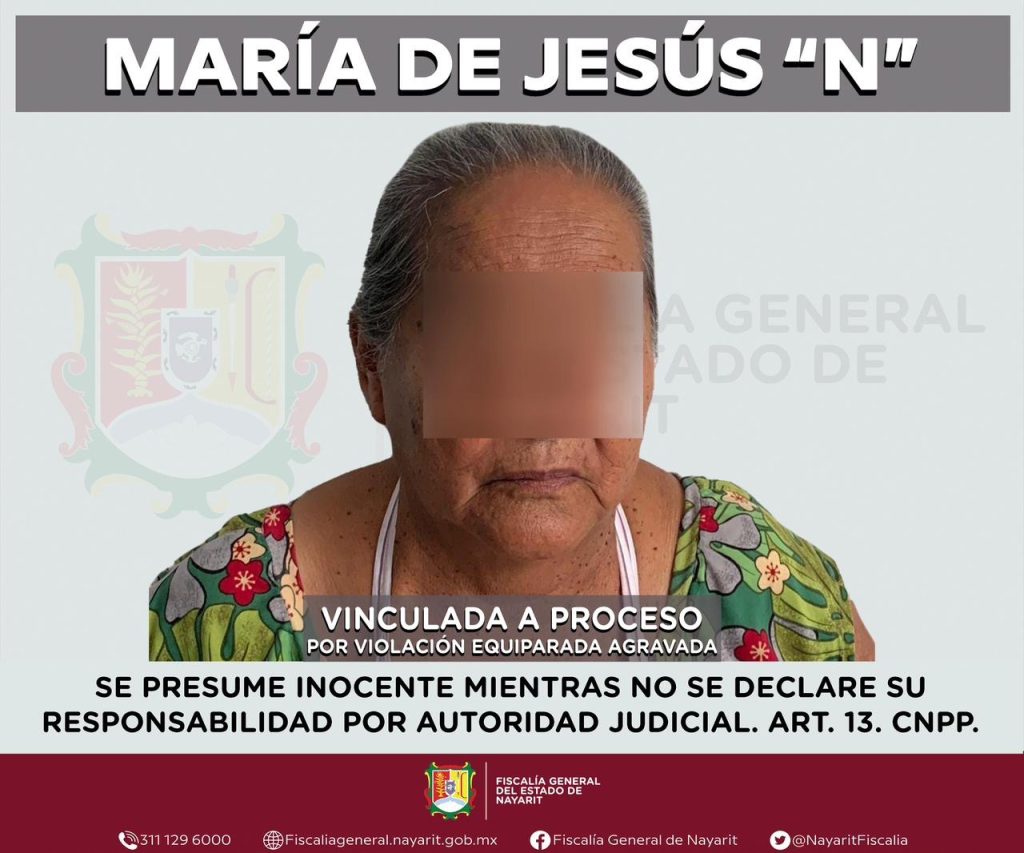 En atención al principio del interés superior de la niñez y en cumplimiento de los tratados nacionales e internacionales en materia de protección de los derechos de niñas, niños y adolescentes, la Fiscalía General del estado de Nayarit informa que un Juez de Control dictó auto de vinculación a proceso contra María de Jesús “N”, por su probable responsabilidad en el delito de violación equiparada agravada, cometido en agravio de un menor de edad.